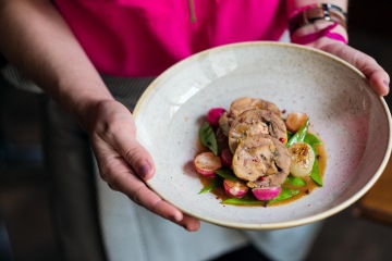 Roláda z perličky s hráškovými lusky, ředkvičkami a nakládané cibulky, jak říká sám šéfkuchař Lukáš, to je jaro na talíři. Chod, který je dost pracný na přípravu, ale o to lepší je výsledná chuť.